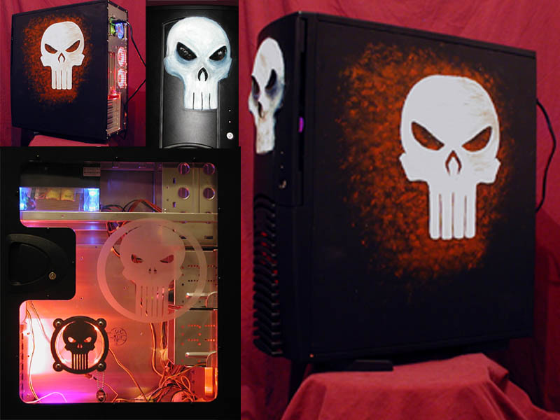 Chieftec aluminum case in Punisher Theme - With Red and UV Cold Cathodes, a Limited Edition (Marvel© Licensed) Punisher laser cut grill with a matching Window Appliqués and a custom 3D sculpted Skull on the front panel