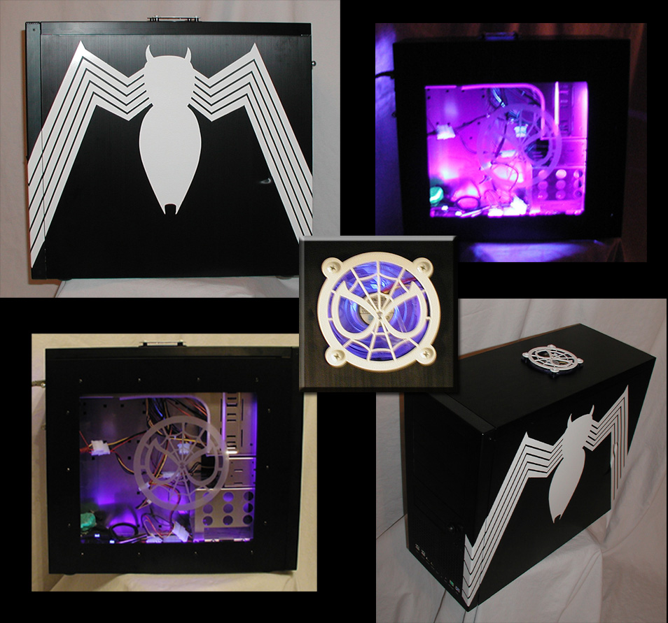 Lian-Li all aluminum case in Symbiote Theme - With purple and UV Cold Cathodes, a White Limited Edition (Marvel© Licensed) Spider-man laser cut grill with a matching Window Appliqués.
